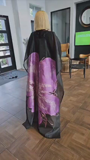 Elegance takes bloom in this captivating floral print overlay dress. This unique design features a striking purple and metallic floral pattern on a shimmering fabric, layered with a sheer black overlay that adds a touch of drama and dimension. The flowing silhouette and wide sleeves create an effortlessly sophisticated look. Perfect for making a stylish statement at evening events, special occasions, or whenever you want to showcase a blend of modern artistry and graceful style.